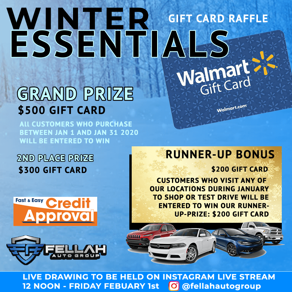 Schedule your appointment today. All customers who purchase a car from January 1st until January 31st will have their names put entered into a raffle. We will give away $500 Walmart Gift Cards as the grand prize. 2nd and 3rd place get $300 and $200 Gift Cards. We will go on Instagram (@FellahAutoGroup) live stream at 12 noon on Friday, February 1st and draw the winning names. While supplies last. Purchases are contingent on financing. Financing decisions are determined by factors such as employment history, residence, and credit history. Not all customers will qualify. See dealer for details. Walmart Inc, Walmart corporation are., registered in the U.S. and other countries. Fellah Auto Group is not affiliated with Walmart Inc. †NO purchase necessary to be eligible for 3rd place prize. *Not all shoppers will qualify for financing.